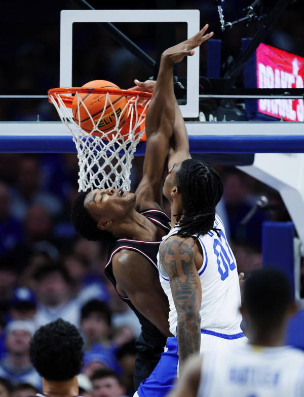 Brandon Garrison (#10) denies a shot by Texas A&M's Manny Obaseki (#35) while Jaxson Robinson provides assistance