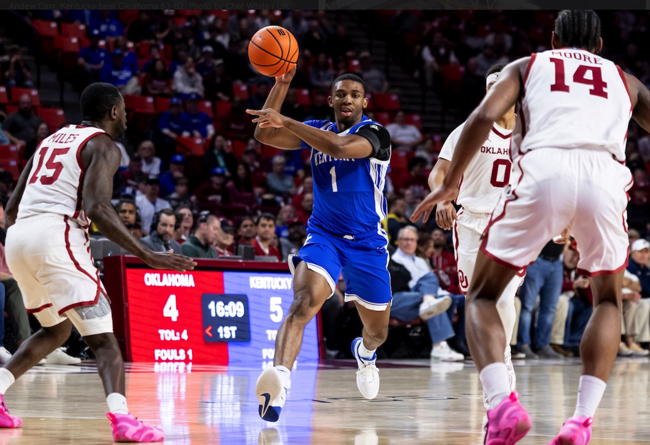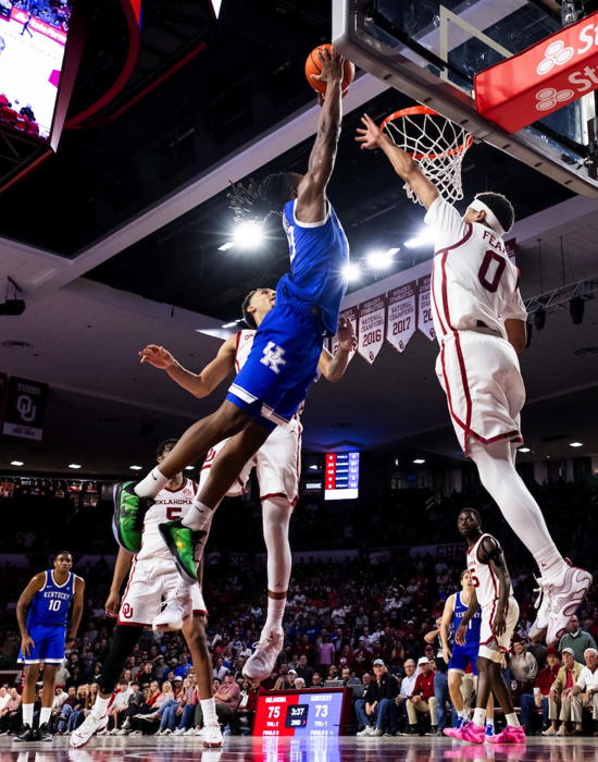 Otega Oweh, Amari Williams and Brandon Garrison all defend a last second shot by Oklahoma's Jeremiah Fears (#0) to secure the Kentucky victory