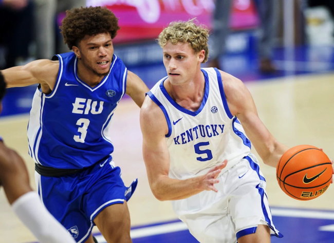 Collin Chandler (#5) drives against Eastern Illinois' and Louisville native Meechie White (#3)