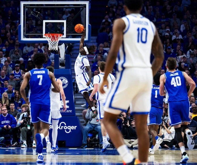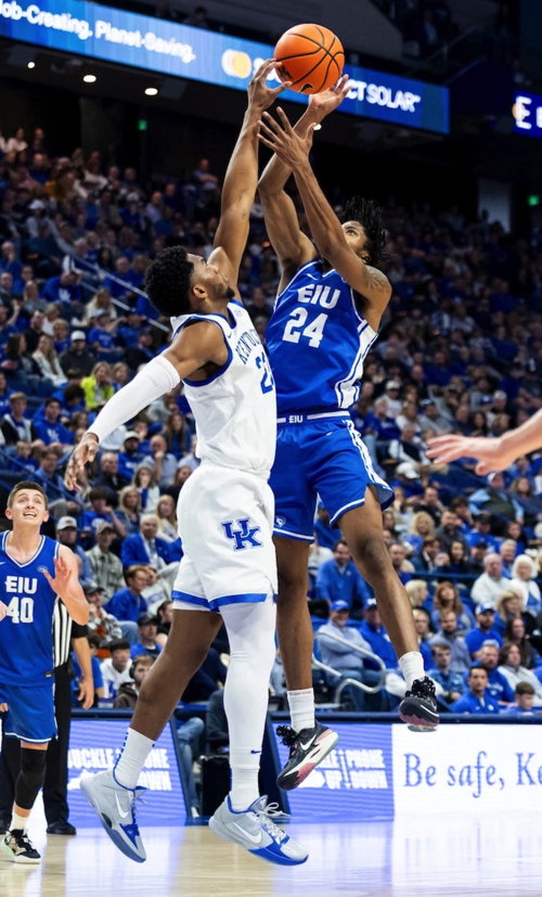 Mouhamed Dioubate blocks the shot of Eastern Illinois' Terry McMorris (#24)