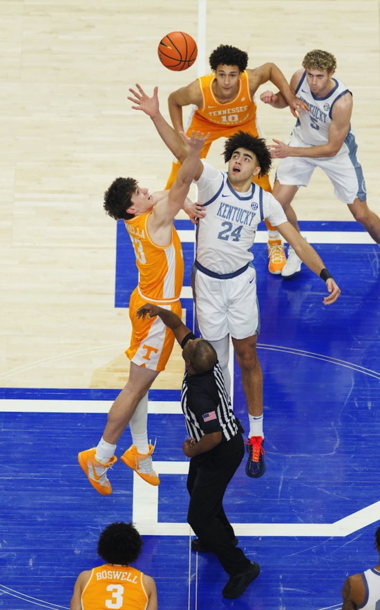 Malachi Moreno (#24) tips off against Tennessee's J.P. Estrella (#130 sporting retro Denim-style jerseys