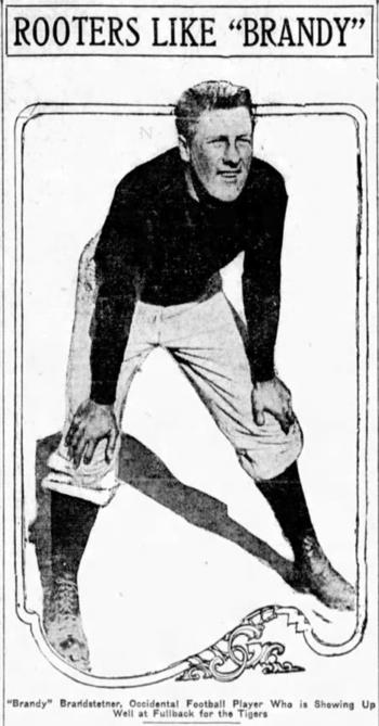 Corporal Brandstetner was widely known as a star football player. He was manager of the Occidental eleven in 1913, and under his leadership the team became one of the strongest in California.