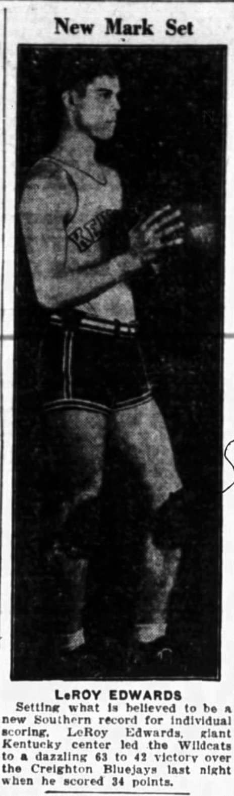 Mr. Edwards scored 343 points that year, his high game being 34 against Creighton University. In one game against the University of Chicago he tallied 26 points to the entire Maroons' 16.