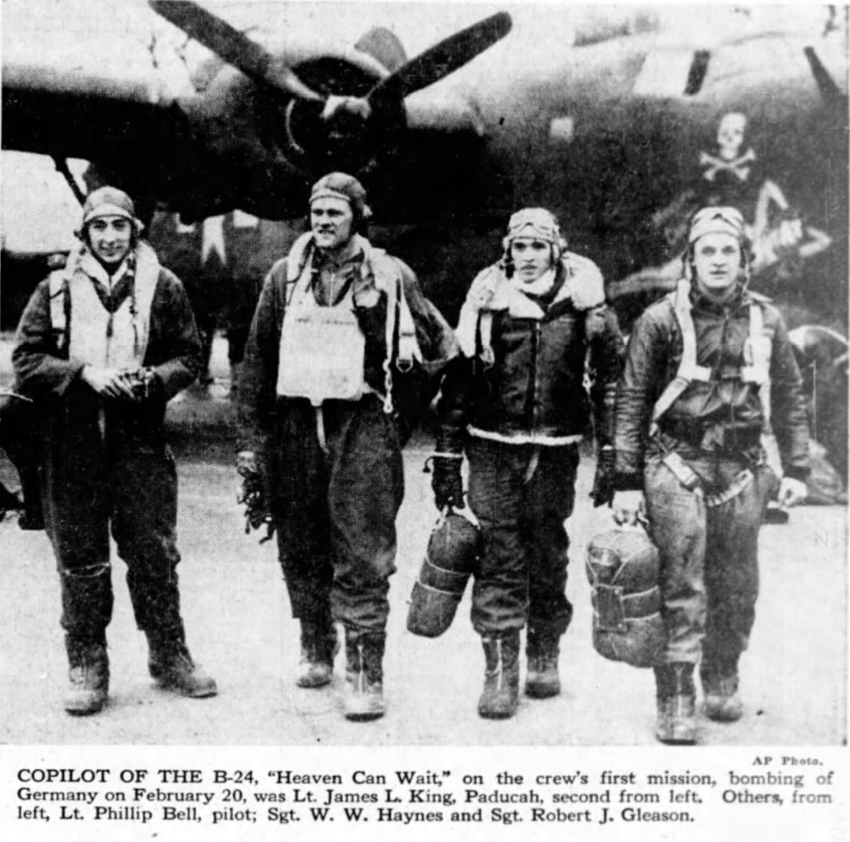 Official announcement has been received by the family of Second Lieutenant James Lybren King of his death on February 24. He was serving as a bomber pilot with the Army Air Corps in a raid over Germany. Mrs. King before her marriage was Miss Helen Owsley Moore of this county.