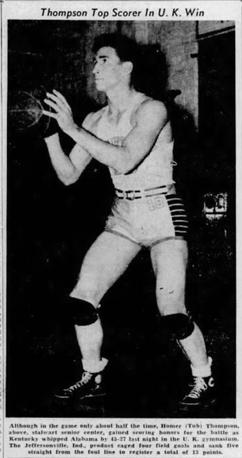 THOMPSON HOMER W. "TUB," 91 of Jeffersonville died Tuesday, June 19, 2007 at Hillcrest Centre in Jeffersonville. He was a native of Jeffersonville, born January 18, 1916, and graduated from Jeffersonville High School where he played on the celebrated 1935 Jeffersonville Basketball team. He was a teacher at his alma mater and was coach of the boy's junior varsity team.