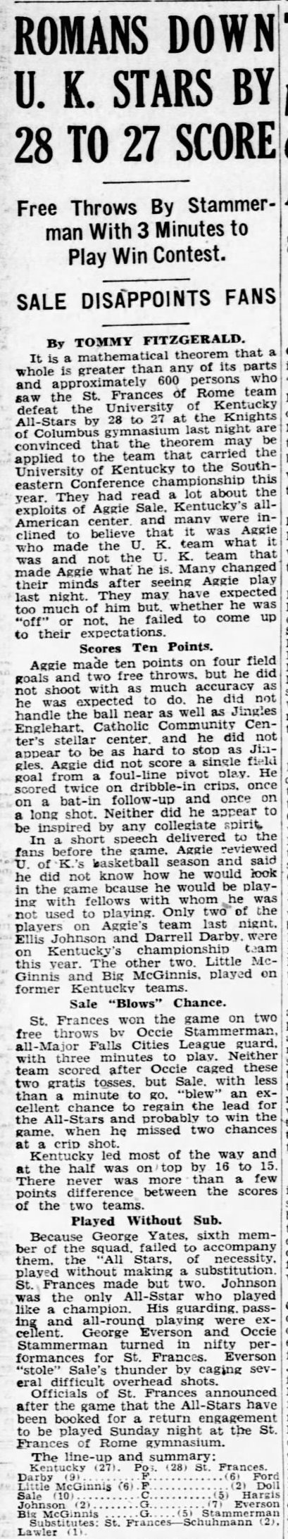| 3/13/1933 | St. Frances of Rome | L | 27-28 | Exhibition (at Louisville, KY)  |