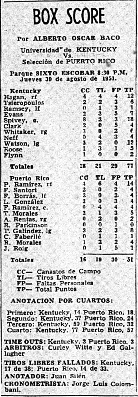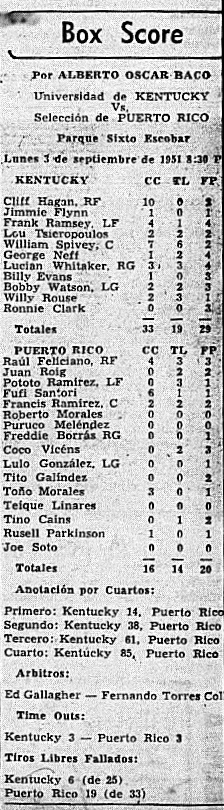 | 8/26/1951 | Ponce Lions | W | 83 - 43 | Exhibition (at Ponce, Puerto Rico)  |