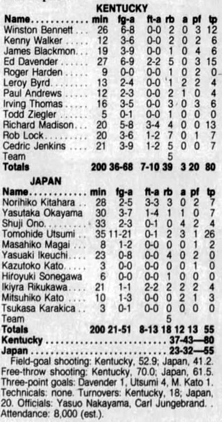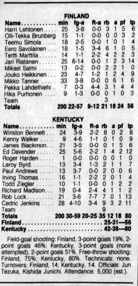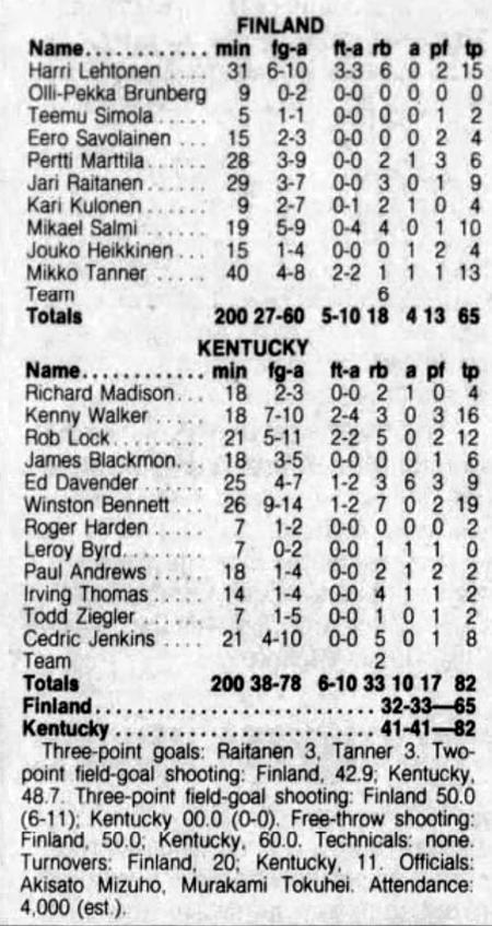 | 6/22/1986 | Finland | W | 87-67 | Kirin World Tournament (at Tokyo, Japan)  |