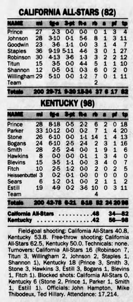 | 11/3/1998 | California All-Stars | W | 103-74 | Exhibition  |