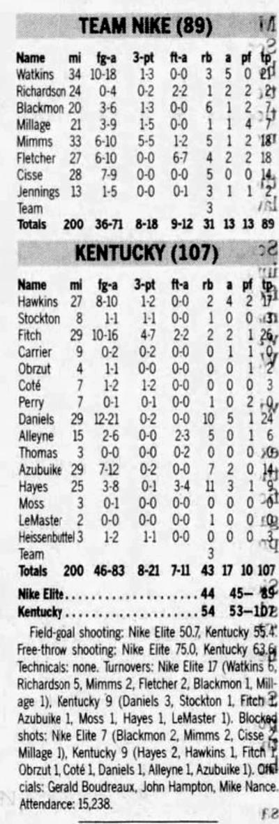 | 11/4/2003 | Team Nike | W | 107-89 | Exhibition  |