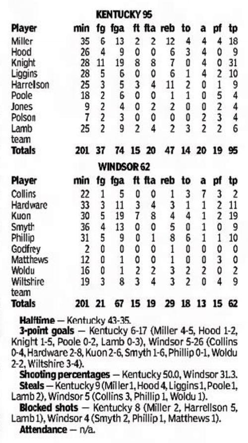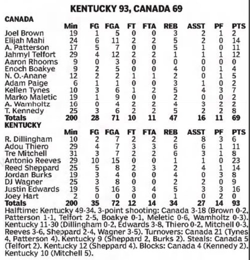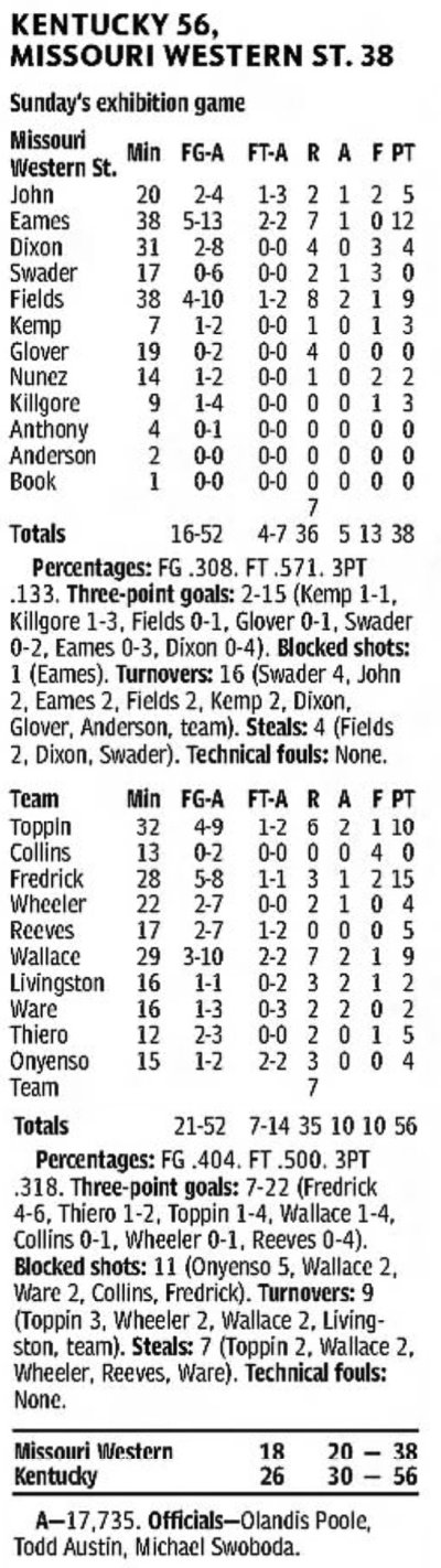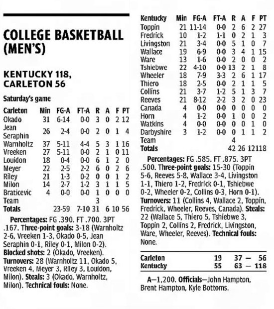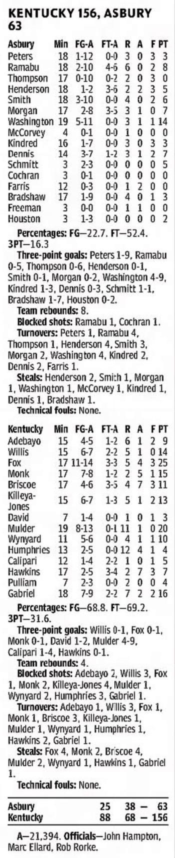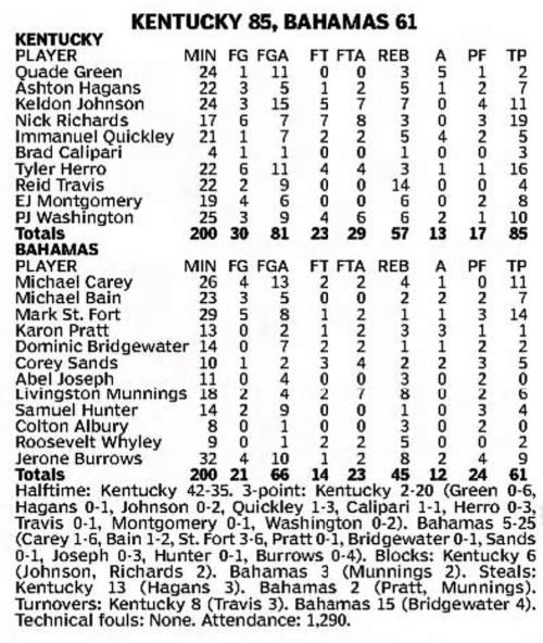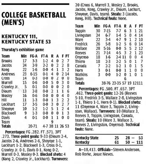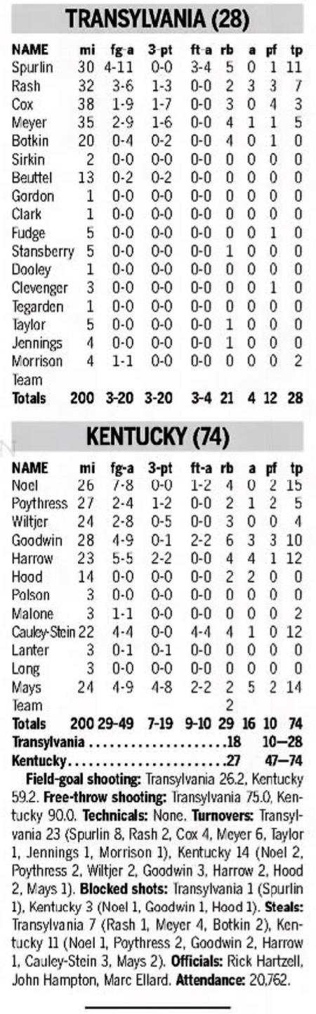 | 10/30/2017 | Morehead | W | 92-67 | Exhibition [Kentucky Cares Classic] |