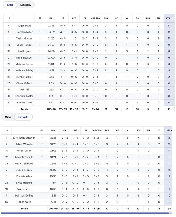 | 11/3/2022 | Kentucky State | W | 111-53 | Exhibition  |