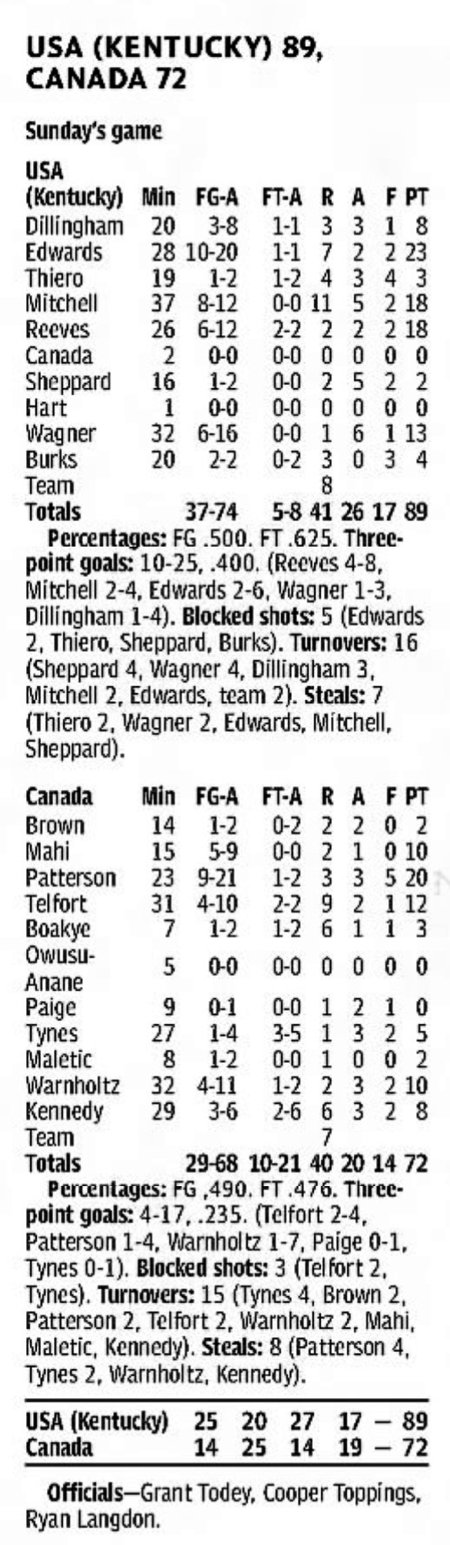 | 8/17/2014 | Dominican Republic | L | 62-63 | Exhibition (at Nassau, Bahamas)  |