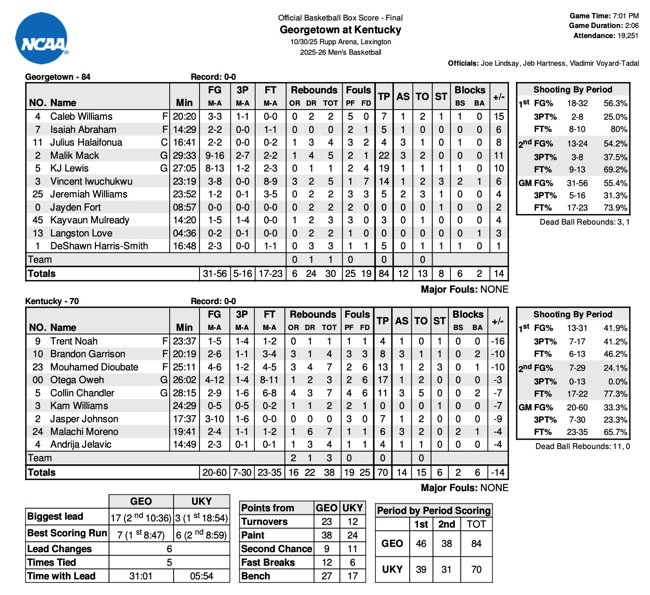 | 10/30/2025 | Georgetown | L | 70-84 | Exhibition  |