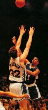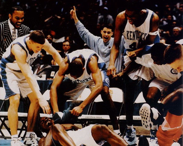 Sean Woods - Woods drove down the side of the key and banked in this 10-foot floater over the outstretched hands of the taller Duke players to give UK the lead with 2.9 seconds left in overtime. This game, against the number one rated and defending champion Blue Devils is considered one of the most exciting and best played NCAA tournament games in history.