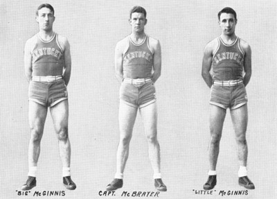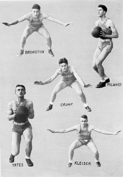 Throughout the season the Kentucky goal was guarded by Captain Paul McBrayer and Lawrence McGinnis in a most capable manner. For their relief there was Bronston, Crump, Trott and Kleiser, "Spooks" Milward, until he was injured in the final Georgia game, was the mainstay in the center of the floor, playing brilliantly. Long George Yates, when called to relieve the injured star, left little to be desired at the pivot post. The call for forwards alternated between Carey Spicer, "Pisgah" Combs and Louis McGinnis, with Hayes Owens ever ready to substitute capably for any of these scoring stars.