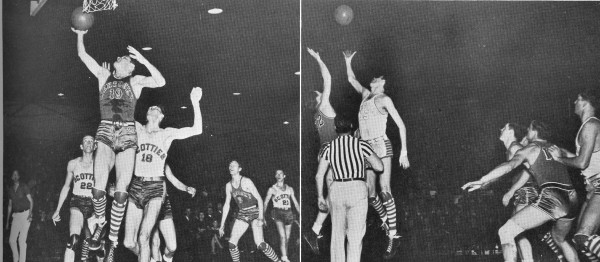 | .. . . Big Jim King goes up to drop the ball in the hoop as the Big Blue takes Maryville in stride . . . | . . . Mel Brewer goes after the tip-off in the Kentucky-Notre Dame classic in the Armory at Louisville . . . |