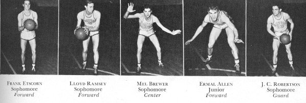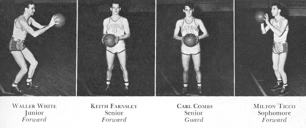 The following men made varsity "K's" in basketball: Lee Huber, Carl Staker, Marvin Akers, Keith Farnsley, Milton Ticco, Jim King, Lloyd Ramsey, Kenneth England, Ermal Allen, Mel Brewer, Waller White and Managers Garret Fitzpatrick and Bud Wilson.