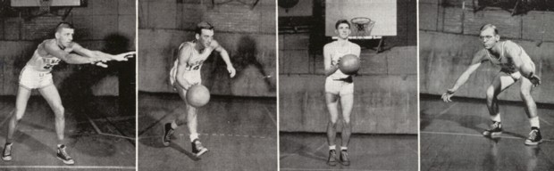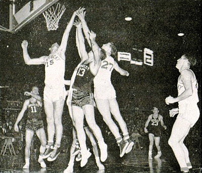 | Wah Jones and Big Al were hands and wrists above all opponents this year on the back boards. Rebounding was the difference in all the tight ones. | Dale Barnstable has the ball pointed out to him while Jim Line and Wah Jones try to get oriented. |