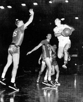 | Rapid Ralph roars by his man again for two more points. | Cliff Barker in his own off hand way scores while Walt Hirsch sees the whole thing. |