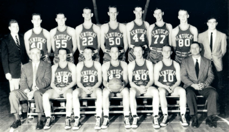 Front Row (l to r):  Head Coach Adolph Rupp, Paul Corum, Gayle Rose, Bill Evans, Gerry Calvert, Dan Chandler, Assistant Coach Harry Lancaster  |