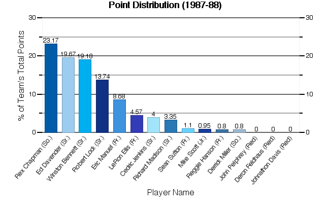 | Rex Chapman | 32 | 1108 | 231 | 461 | 50.11 | 66 | 159 | 41.51 | 81 | 102 | 79.41 | 93 | 117 | 53 | 16 | 61 | 85 | 609 | 19.03 |