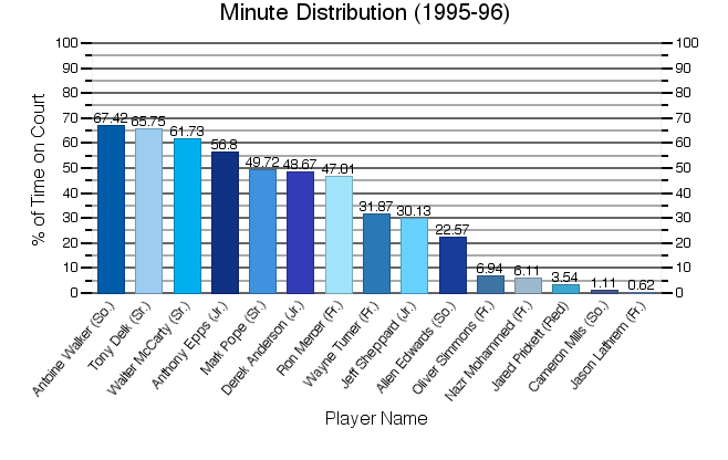 | Tony Delk | 36 | 947 | 229 | 464 | 49.35 | 93 | 210 | 44.29 | 88 | 110 | 80 | 97 | 53 | 150 | 64 | 67 | 13 | 72 | 64 | 639 | 17.75 |