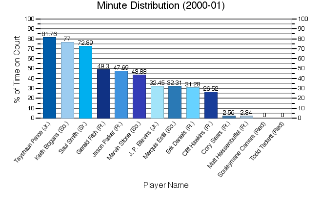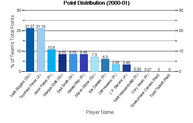 | Keith Bogans | 34 | 1051 | 210 | 444 | 47.3 | 74 | 205 | 36.1 | 83 | 119 | 69.75 | 93 | 65 | 158 | 80 | 35 | 8 | 76 | 89 | 577 | 16.97 |