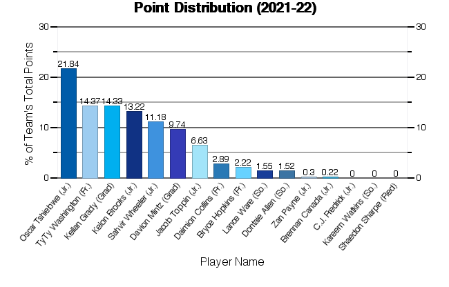 | Sahvir Wheeler | 30 | 937 | 120 | 272 | 44.12 | 16 | 52 | 30.77 | 46 | 59 | 77.97 | 59 | 18 | 77 | 207 | 33 | 2 | 71 | 91 | 302 | 10.07 |