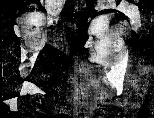 | Coach Diddle and Coach Rupp sit next to each other at the 1940 Kentucky High School basketball tournament |