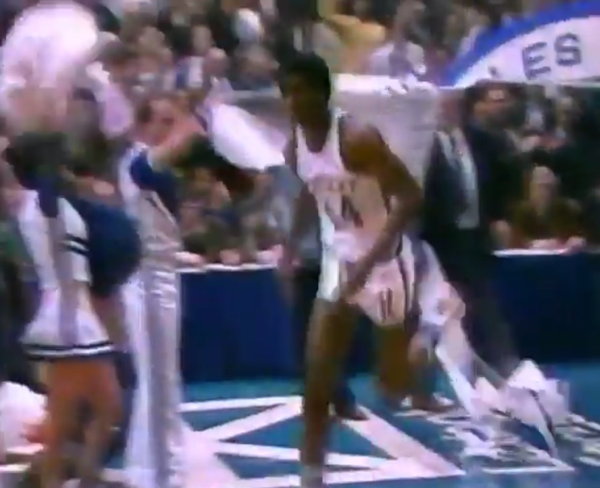 Later on, apparently starting in 1977 the University began to employ a large hoop covered in paper for the players to run through during introductions. The very first seniors to run through the hoop were the duo of Larry Johnson and Merion Haskins.