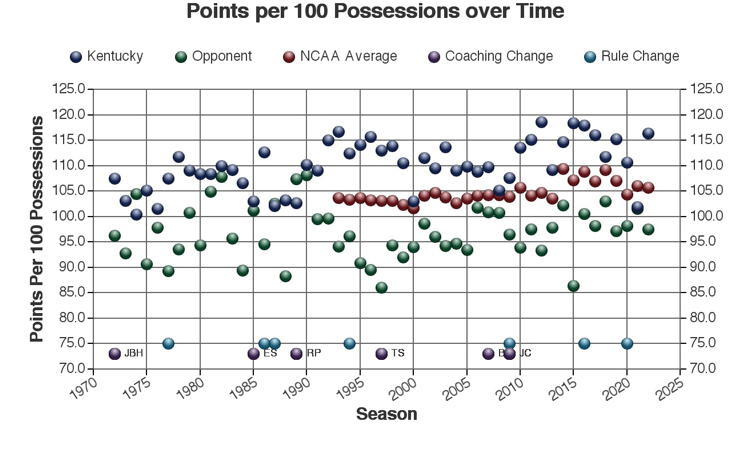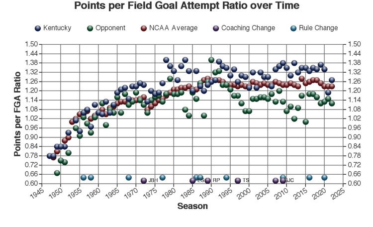 There are at least three types of factors to consider when viewing these trends: 1.) The coach of Kentucky at the time 2.) rules changes which may or may not have affected the game and 3.) other changes in college basketball which may have affected the game. Coaching changes and major rules changes are marked on many of the plots as a guide.