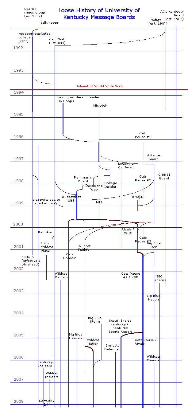 Talking about the Wildcats has been a tradition in Kentucky for over 100 years. With the internet, this tradition has taken on new forms with many different sites and formats popping up through the years. For fun, I put together a rough timeline of the various discussion groups, many which are included below.